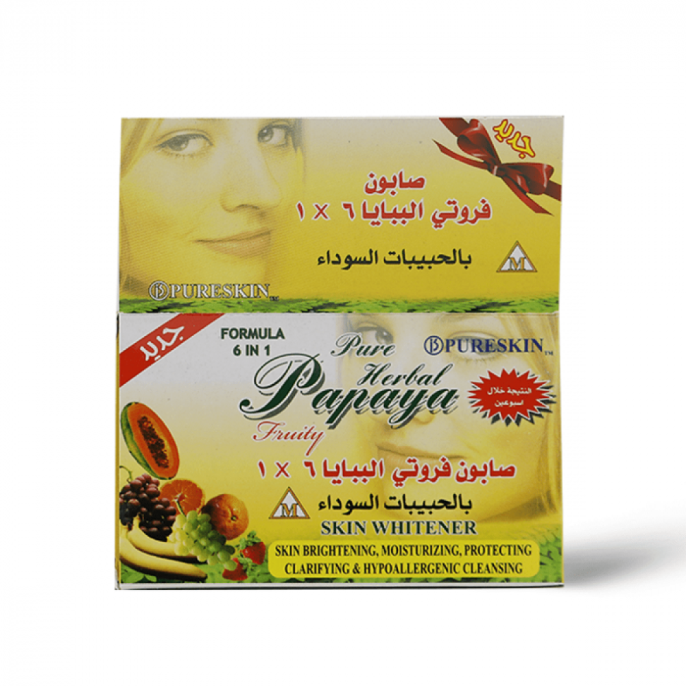 صابون البابايا فروتي 6 في 1 يحتوي على خلاصة الحبة السوداء وفيتامين B3 يُرطب بعمق ويحمي من الضرر الناتج عن التعرض للشمس.