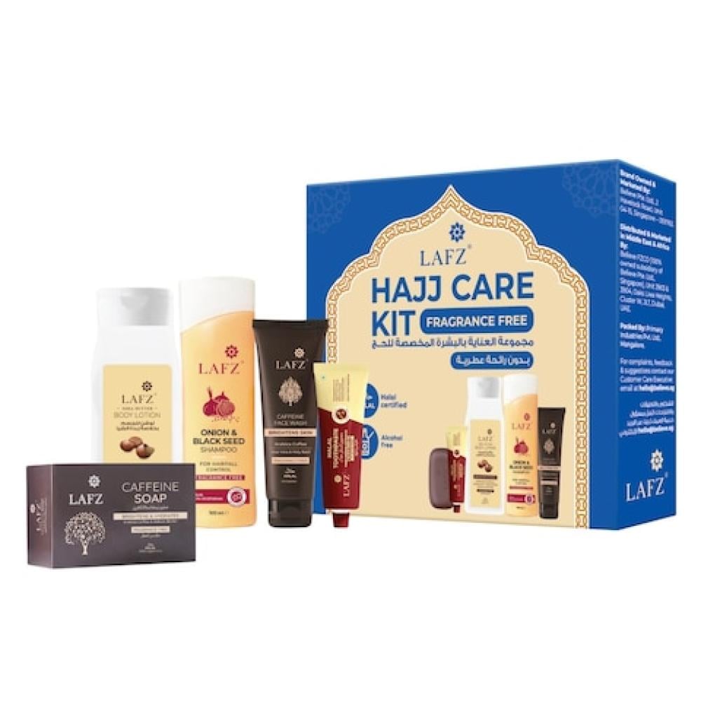 لافز مجموعة الحج والعمرة للعناية بالبشرة والشعر خالية من الكحول وبدون رائحة عطرية.